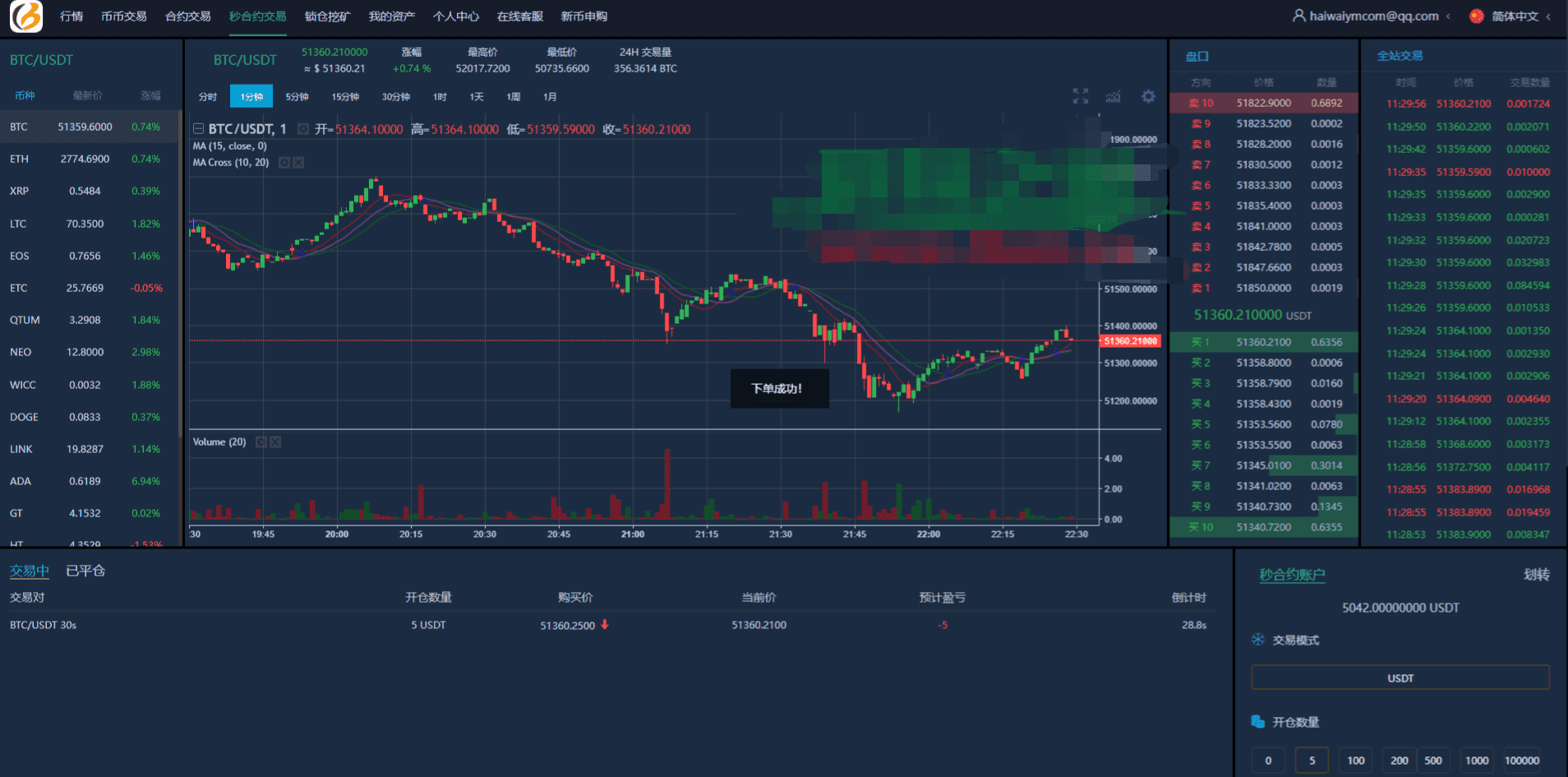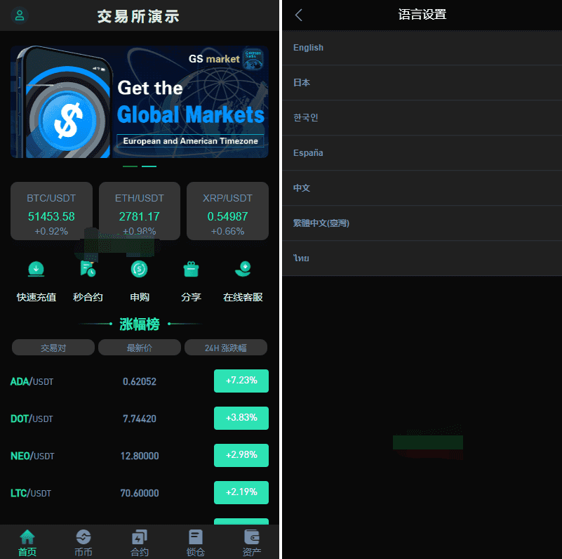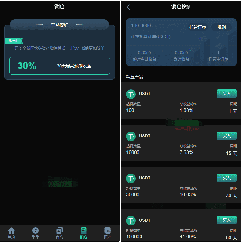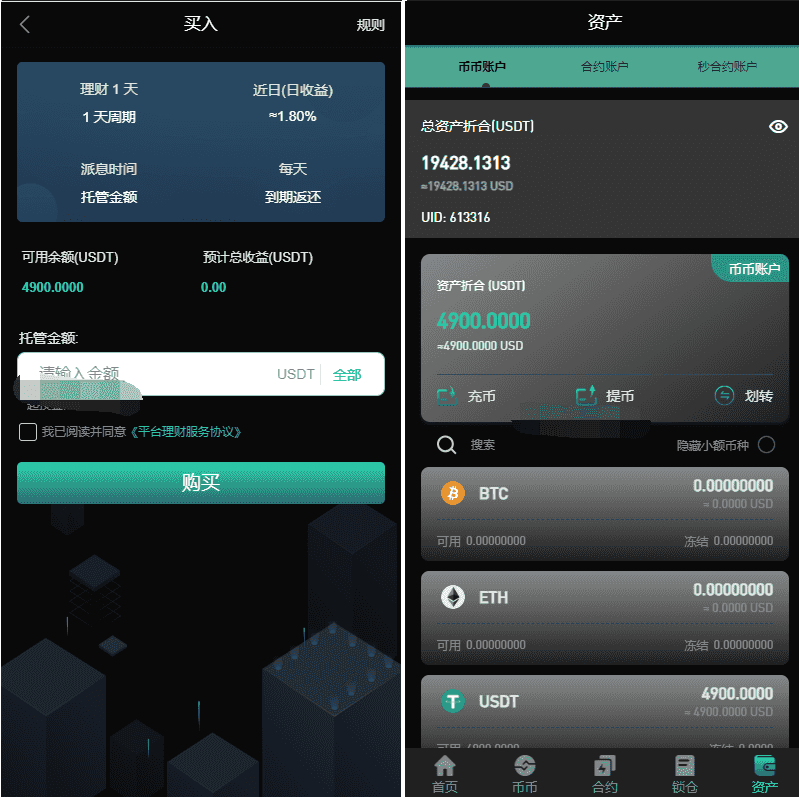 系统功能支持:秒合约、合约、锁仓挖矿、新币认购功能,无平台币