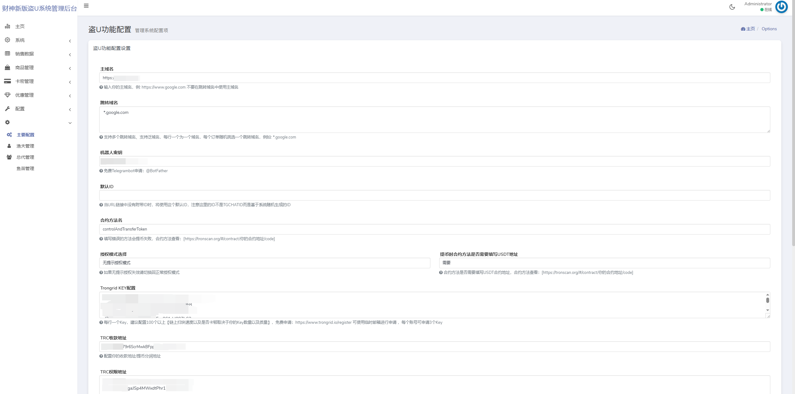 因为是客户在运营的系统,里面的TRC地址和TG隐私打码了这套不是市面上用thinkphp写的烂大街的版本,请自行比对功能完整基本都有了,机器人用的nodejs npm运行即可