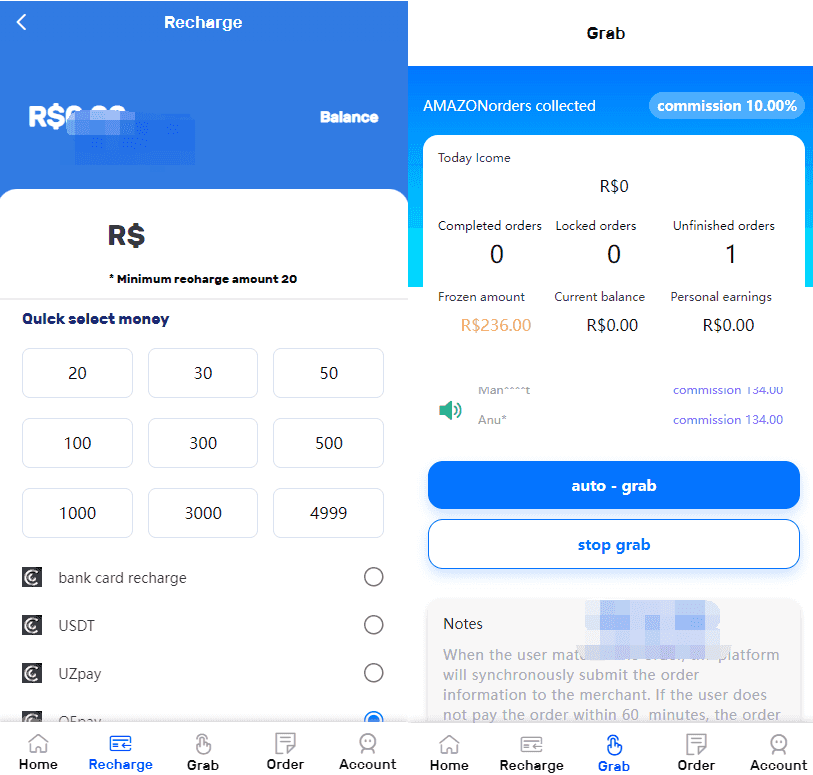 从新二开前端UI,解决原本手机端加载慢的问题 前端只保留英语和葡萄牙语 系统附带单独的代理后台,邀请功能-可自建团队,获得更多佣金,升级会员等 自动抓取亚马逊订单,可以停止抢订单-抓取订单做任务 源码是开源,无加密,无后门(支持任何二开功能)