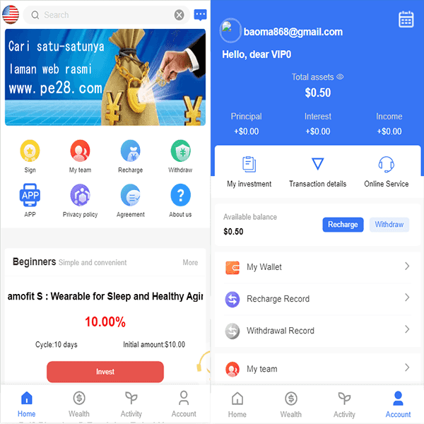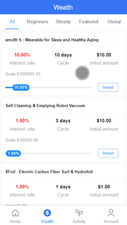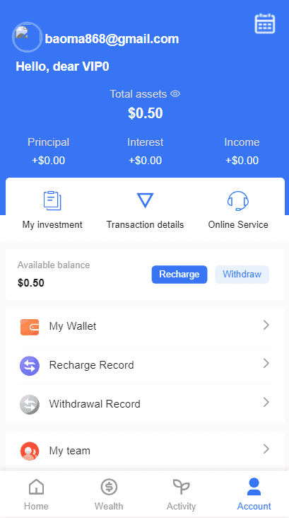 用户注册成功->认证邮箱->充值->购买项目->生成订单->根据设定的收益每日返利->末天返还本金->提现时先添加钱包->发起提现->后台审核通过->提现到账